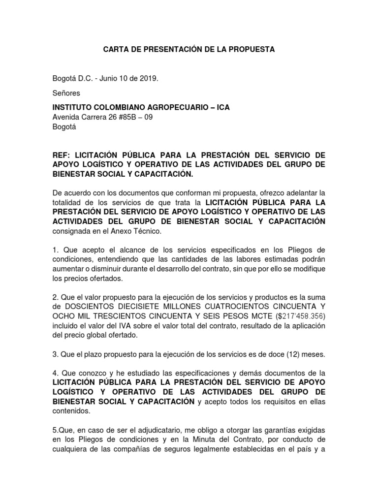 Que esta propuesta y el contrato que llegare a celebrarse solo comprometen a los firmantes de esta carta. Luego de haber examinado el pliego de condiciones incluyendo sus enmiendas N el proponente debe insertar los nmeros de las enmiendas que hubiese recibido de las cuales confirmamos recibo por la presente los suscritos ofrecemos suministrar los bienes de referencia de. CARTA DE PRESENTACION Propuesta presentada a la UNIVERSIDAD DE NARIO para la LICITACION PUBLICA No Ciudad y Fecha Nosotros los suscritos.